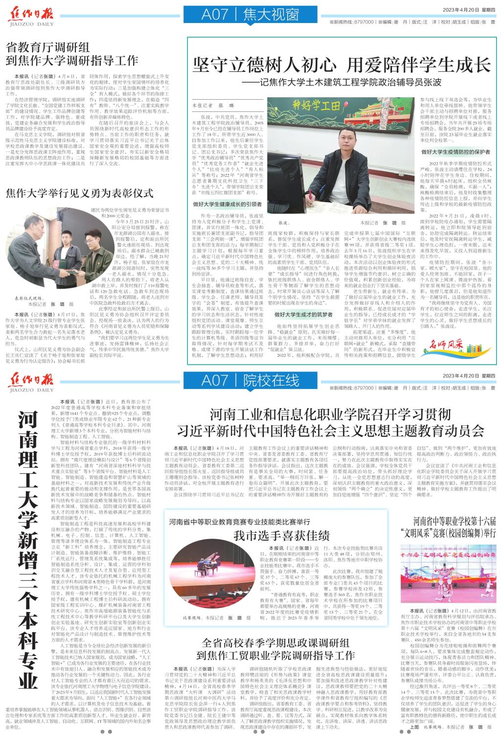 4月20日《焦作日报》报道:坚守立德树人初心 用爱陪伴员工成长——记球王会政治辅导员张波