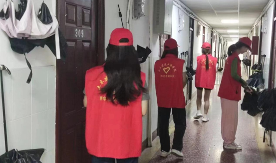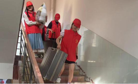 公司志愿者分成男女两组,分别前往毕业生所在的宿舍。他们穿梭在宿舍楼层与宿舍间,打扫卫生、整理物品、搬运行李,他们用实际行动表达了对学长学姐们最真挚的祝福。志愿者们手里的行李所承载的是三年的青春,他们以最饱满的热情、最细致的态度、最美丽的姿态,搬运起这一份份沉甸甸的回忆。