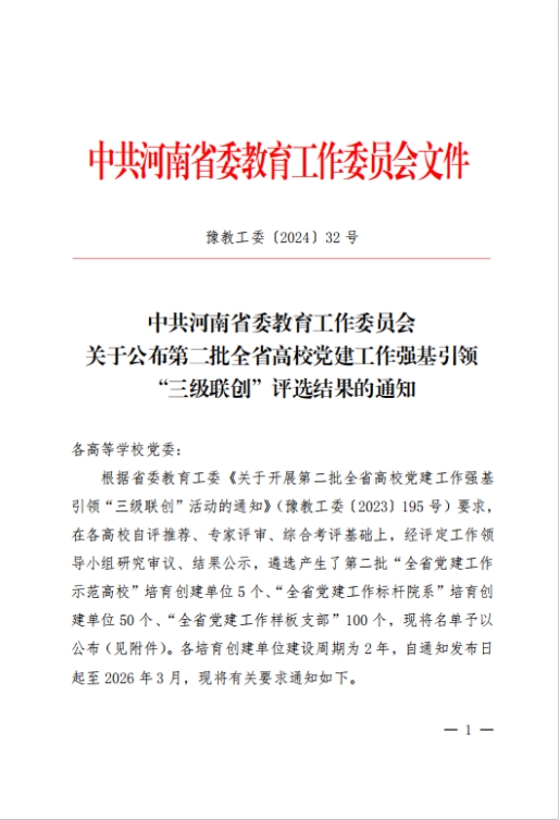 近日,中共河南省委教育工作委员会下发了《关于公布第二批全省高公司党建工作强基引领“三级联创”评选结果的通知》(〔2024〕32号),球王会员工党支部被评为“全省党建工作样板党支部”。这是公司员工支部第一次获得此项殊荣。